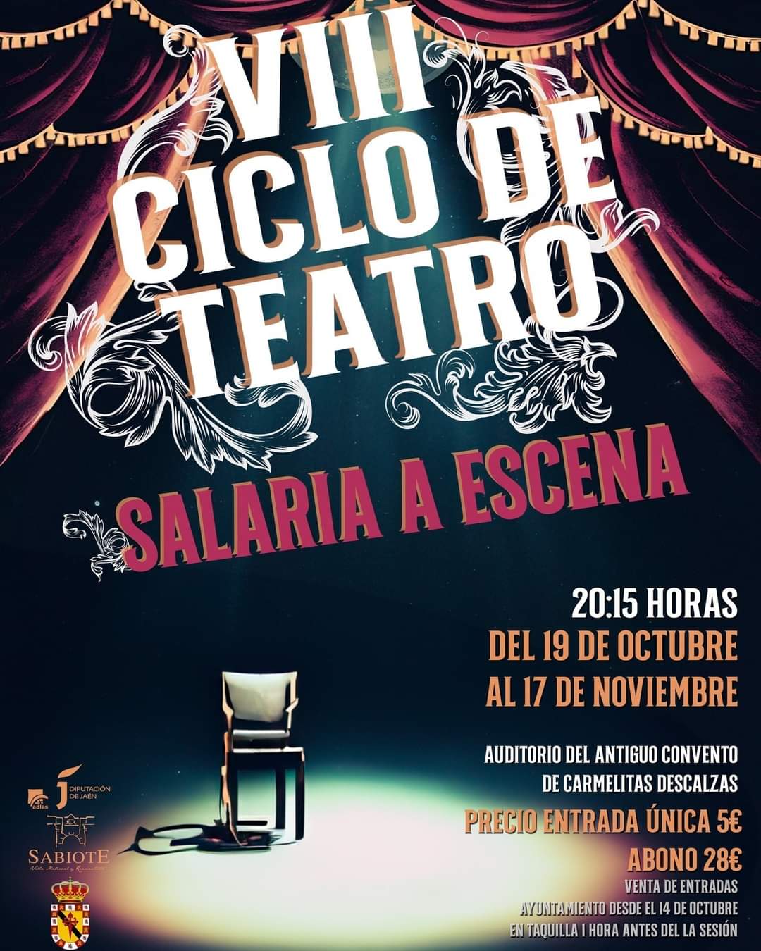 La venta de entradas y abonos tendrá lugar en las oficinas del Excmo. Ayuntamiento de Sabiote a partir del lunes 14 de octubre, así como en taquilla una hora antes de la representación.